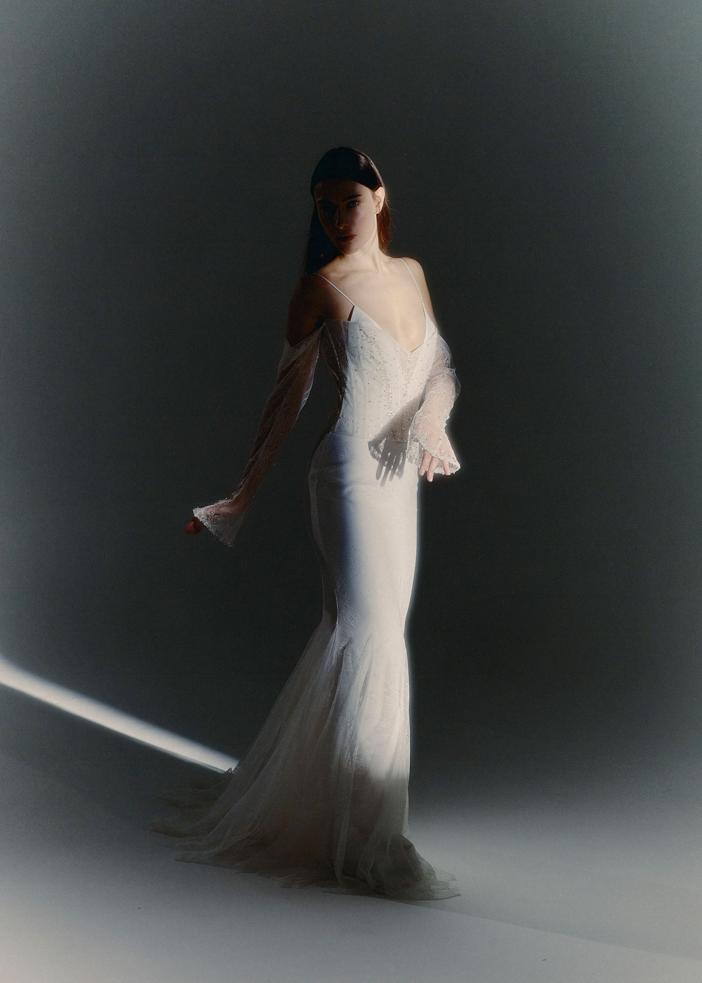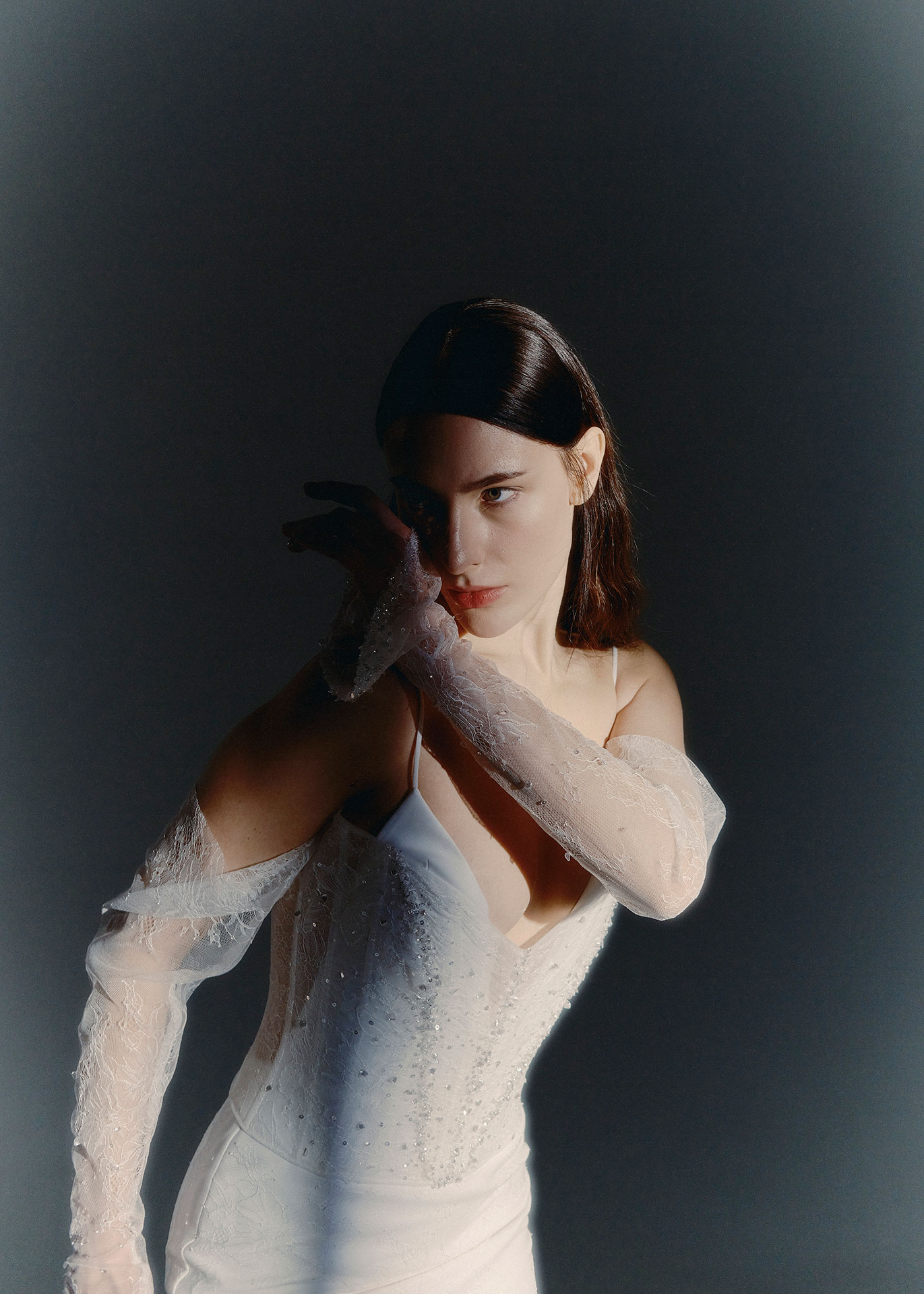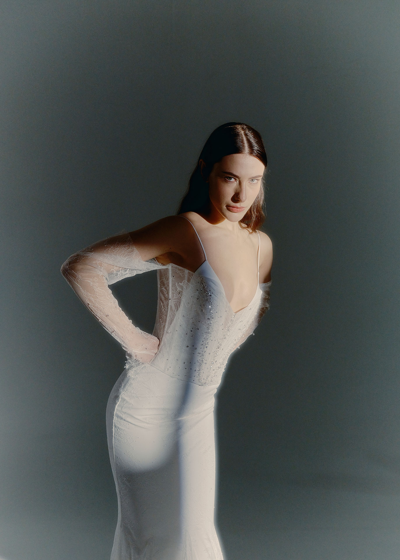 An elegant lace wedding dress from The Sculpted Collection, combining delicate craftsmanship with sculptural structure. A Chantilly lace corset, hand-embroidered with micro beads, is layered over a minimal V-neck slip dress, creating depth, texture and modern bridal elegance.