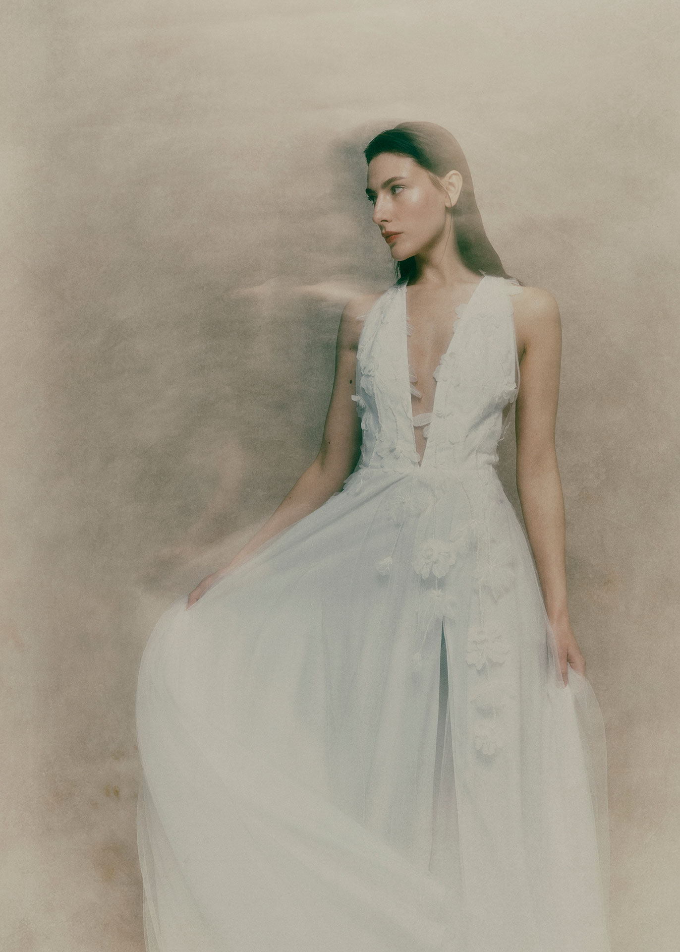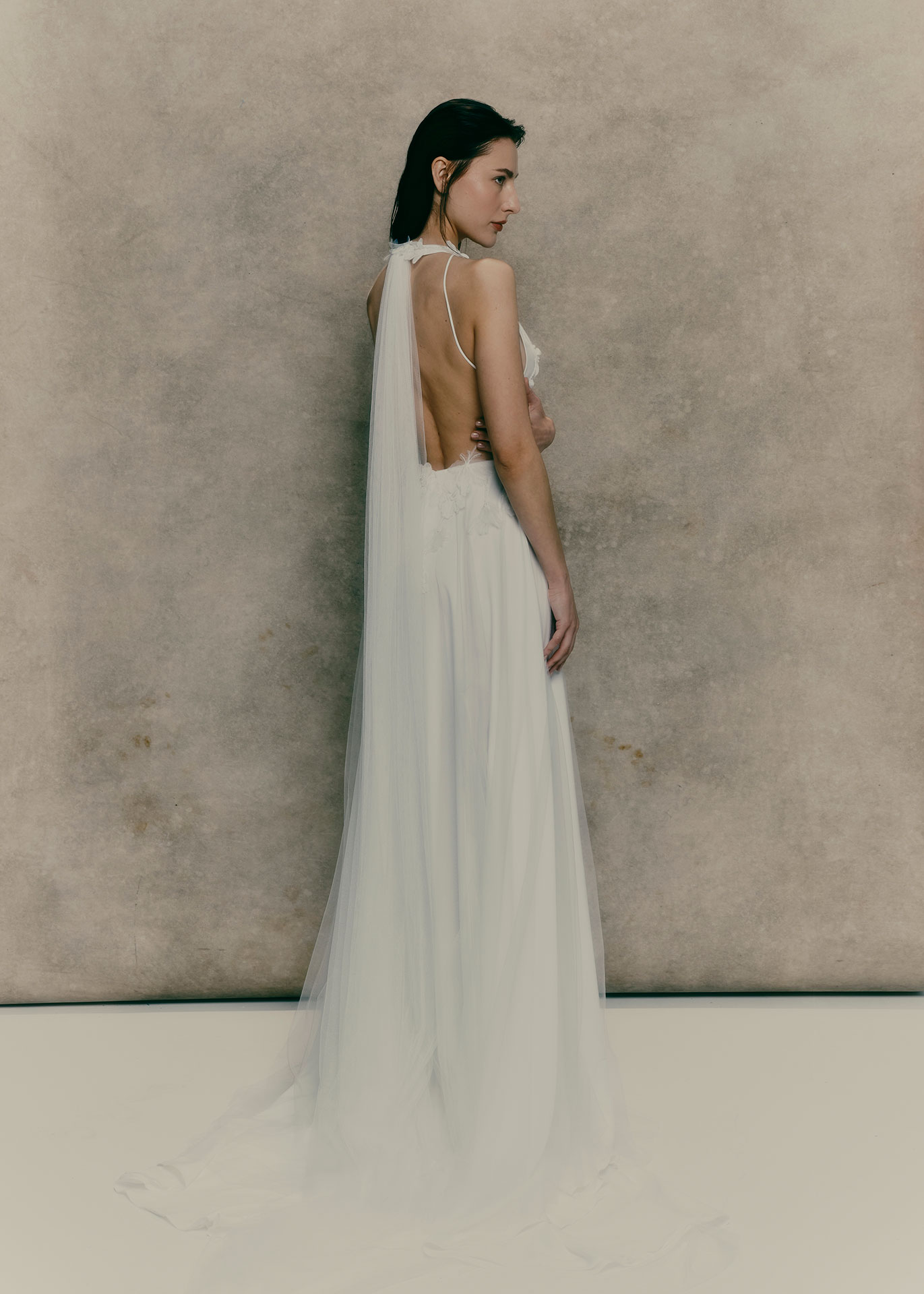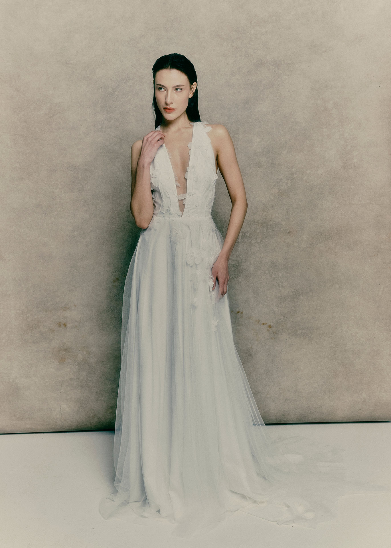 A romantic tulle wedding dress defined by the signature halter neckline of The Sculpted Collection. Delicate floral motifs frame the bodice, while the open back and flowing tulle skirt create an effortlessly light and modern bridal silhouette.