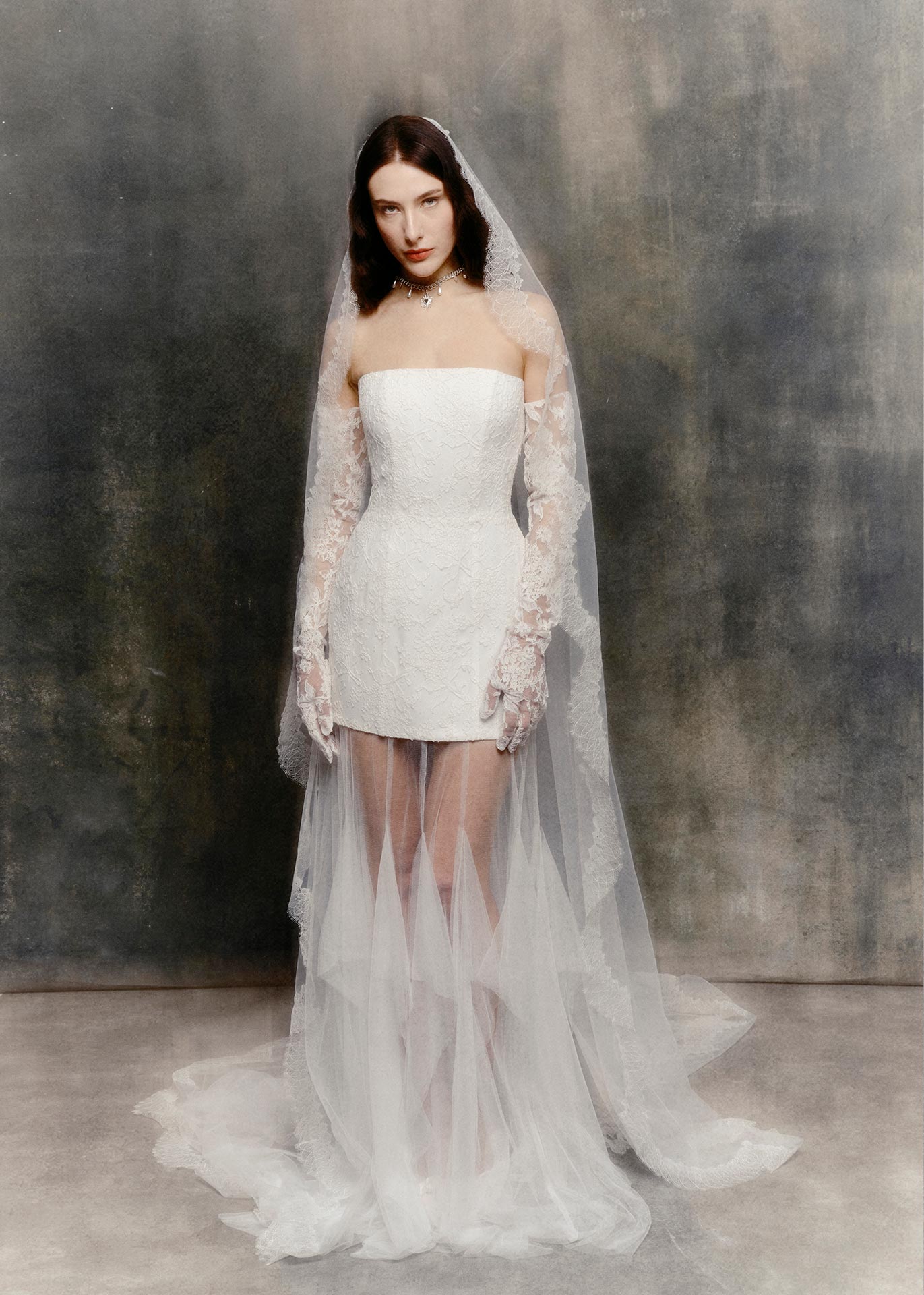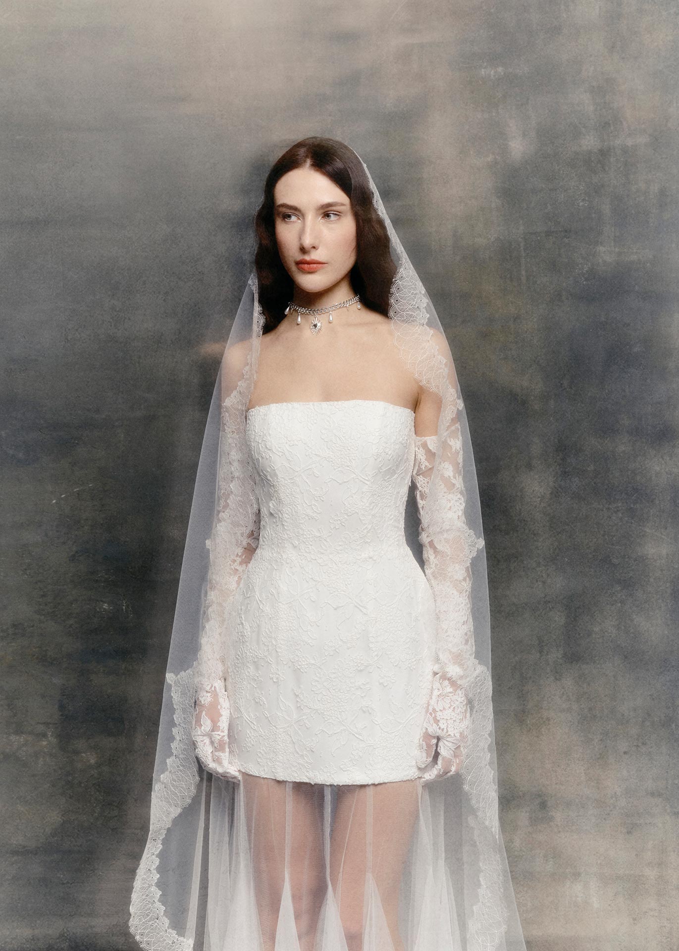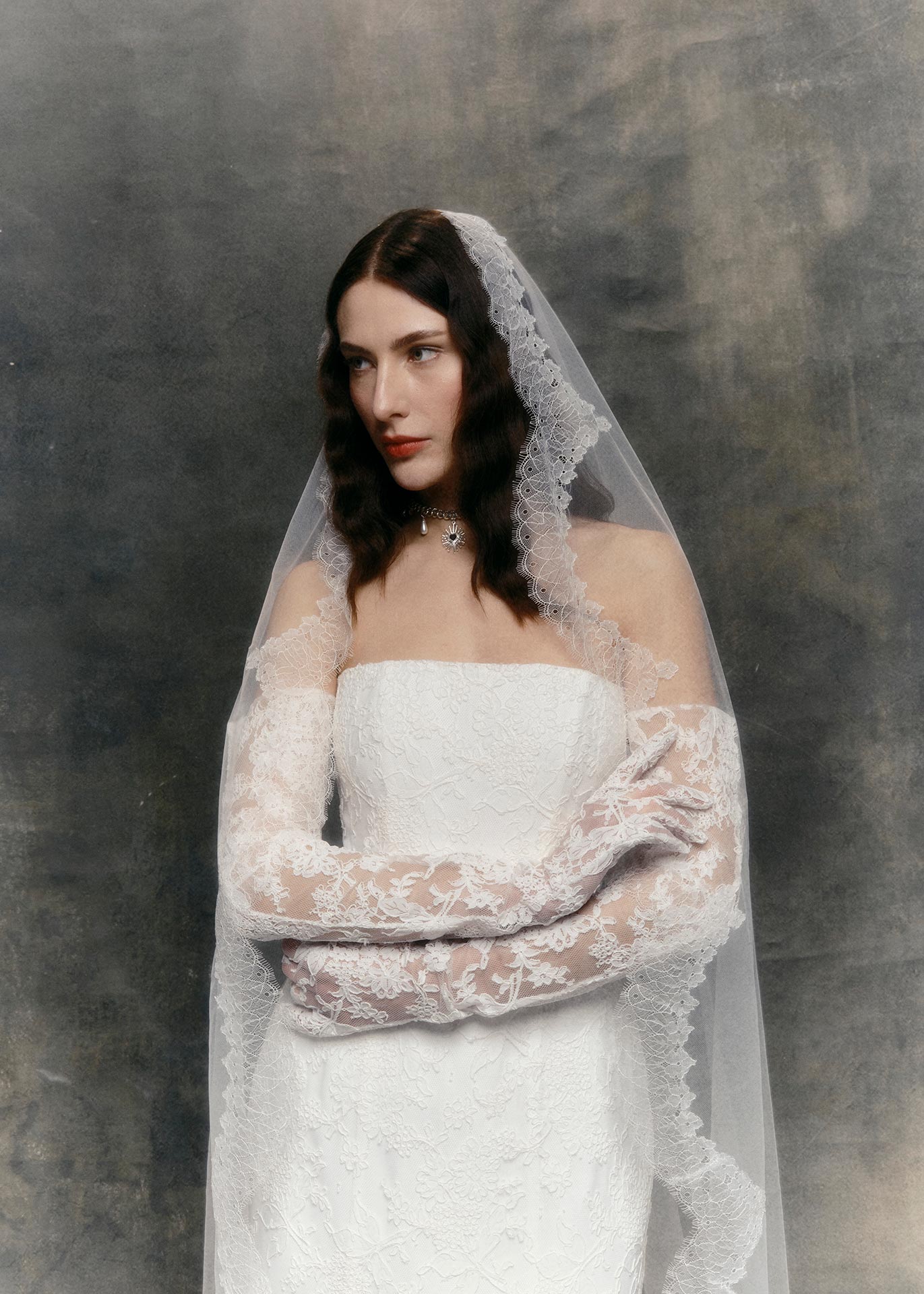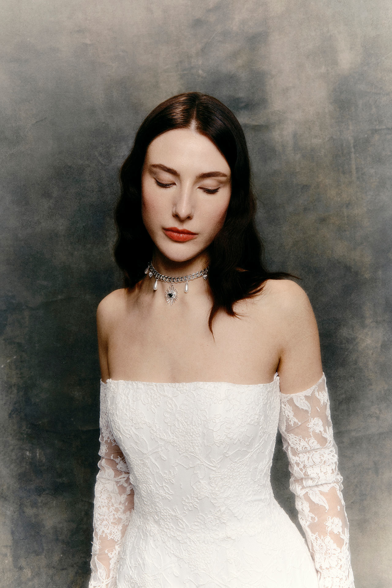 A delicate lace wedding dress from The Sculpted Collection, defined by refined craftsmanship and soft structure. Corded lace motifs are individually placed by hand over the softest custom tulle, creating a light and dimensional bridal silhouette.